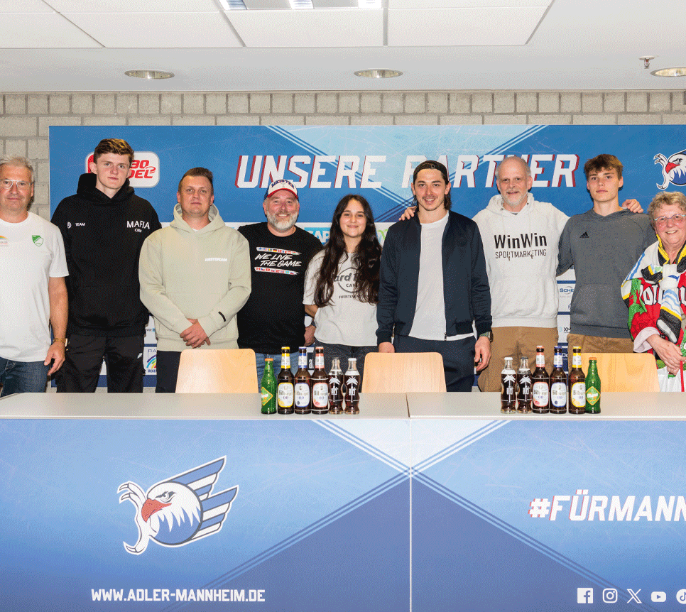 (8) Die Gesprächsrunde mit Daniel Fischbuch bei den Adlern Mannheim für die SPORTHEILBRONN-Titelstory mit Unterstützung der „Kollegen für einen Tag“ Assala, Oli und Andreas.