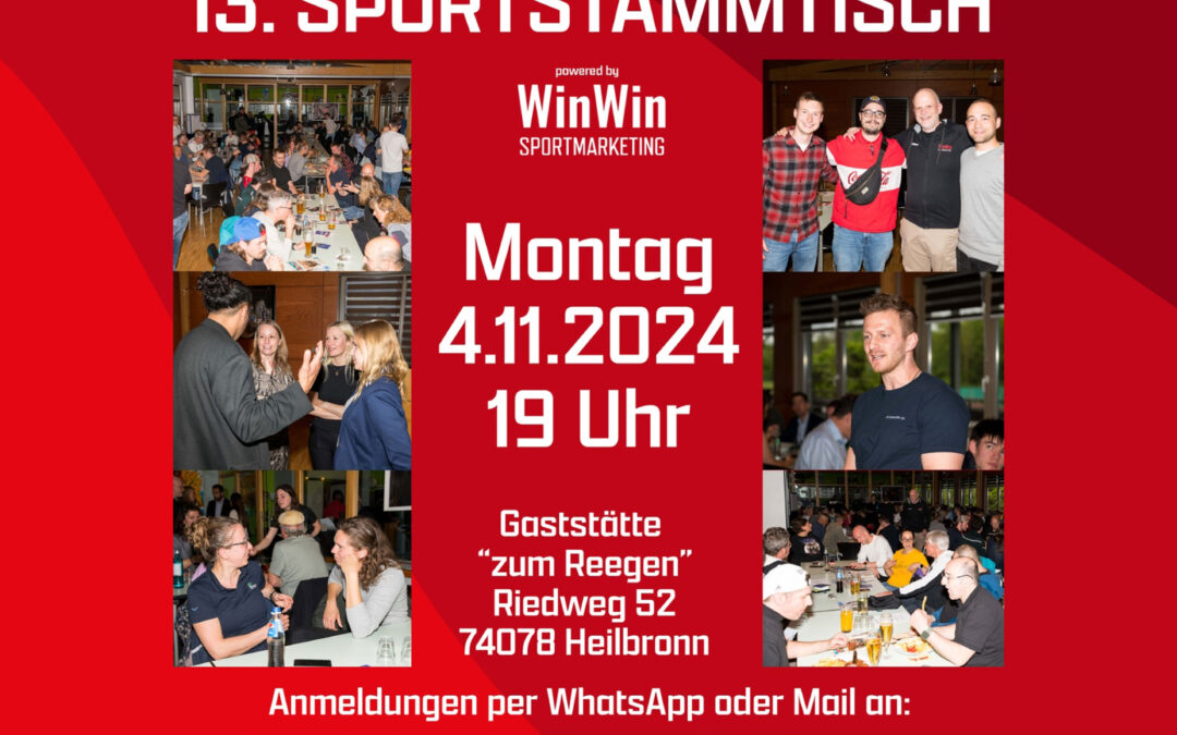 Wir treffen uns am 4. November 2024 um 19 Uhr in der Gaststätte zum Reegen in Heilbronn-Frankenbach zum Sportnetworking.